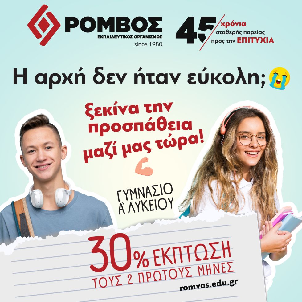 30% ΕΚΠΤΩΣΗ τους 2 πρώτους μήνες αποκλειστικά για μαθητές ΓΥΜΝΑΣΙΟΥ & Α΄ ΛΥΚΕΙΟΥ!