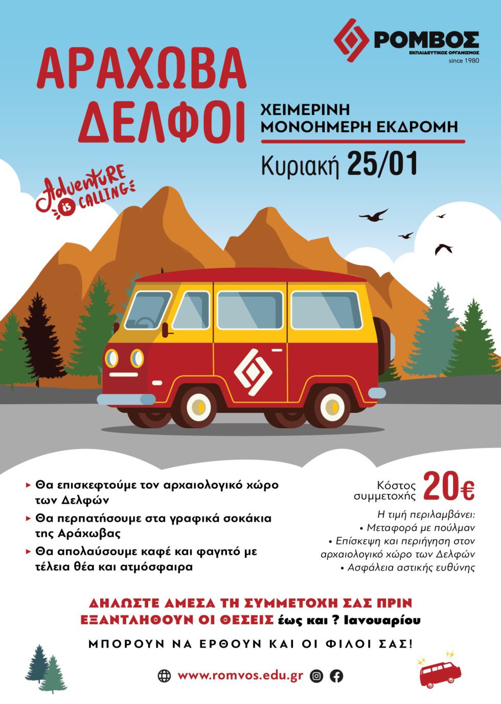 Ο Εκπαιδευτικός Οργανισμός ΡΟΜΒΟΣ διοργανώνει χειμερινή μονοήμερη εκδρομή στην Αράχωβα και τους Δελφούς την Κυριακή 25 Ιανουαρίου.