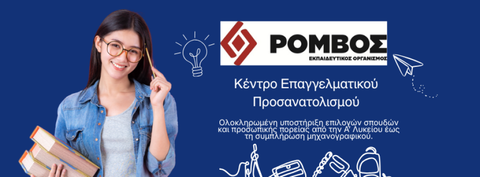 Ο Εκπαιδευτικός Οργανισμός «ΡΟΜΒΟΣ» εδώ και 47 χρόνια πρωτοπορεί στον χώρο της εκπαίδευσης παρέχοντας στους μαθητές του συνολική υποστήριξη και καθοδήγηση για τον προσδιορισμό και την επίτευξη των στόχων του. Για εμάς η εκπαιδευτική διαδικασία είναι άρρηκτα συνδεδεμένη και με τον επαγγελματικό προσανατολισμό.